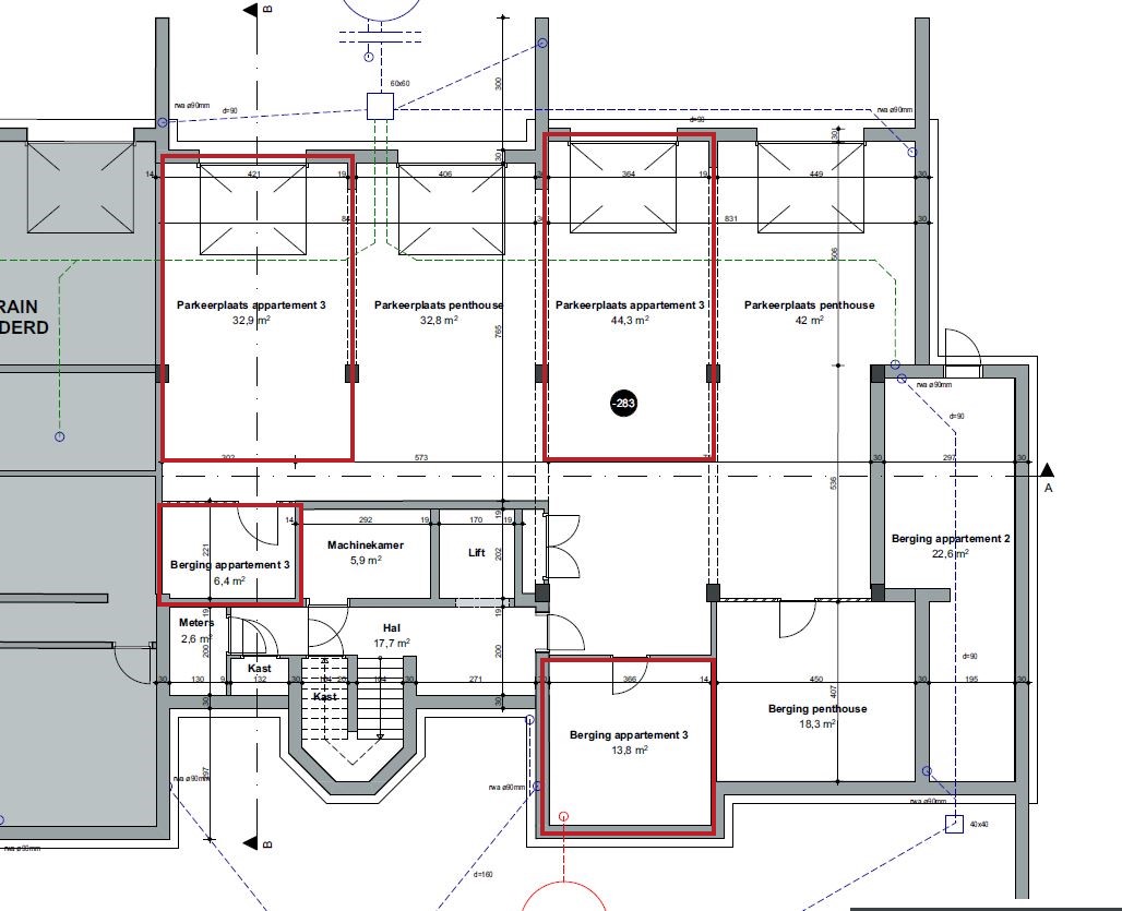 Kelder privatief: 2 parkeerplaatsen (± 44,3 m² en ± 32,9 m²) met elk een automatische sectionaal poort, traphal, toegang tot lift, berging 1 (± 6,4 m²), berging 2 (± 13,8 m²).