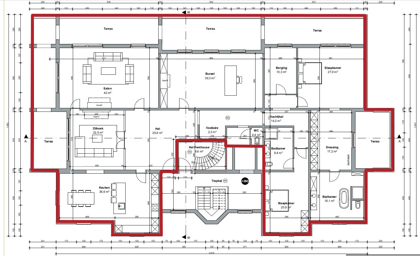 Het gehele appartement is ingericht met het oog op comfort. De riante leefkeuken biedt veel plaats om gezellig te tafelen. De indrukwekkende hoofdslaapkamer is uitgerust met een genereuze dressing en een badkamer die van alle gemakken voorzien is. De comfortabele tweede slaapkamer biedt toegang tot een eigen badkamer met inloopdouche. Aan de linkerzijde en volledige achterzijde van het appartement loopt een terras van vorstelijk formaat, waarop het heerlijk vertoeven is. In de kelder bevinden zich bovendien 2 parkeerplaatsen met automatische sectionaal poort en 2 bergingen.