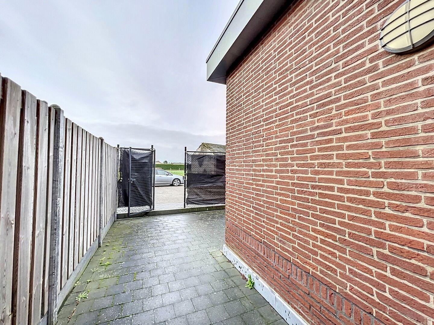 Gelijkvloers: inkomhal, 2 slaapkamers, badkamer, toilet, woonkamer, keuken, berging, inkomhal achter/sas en terras.
