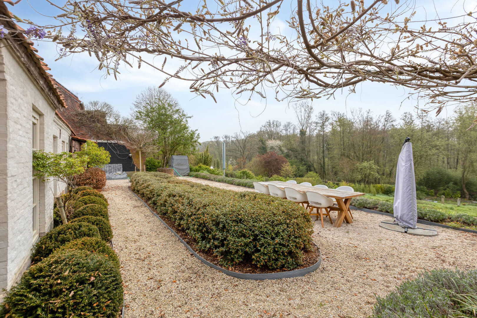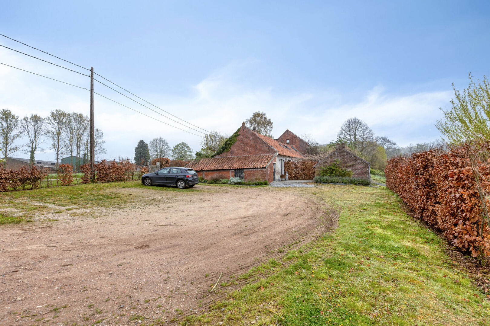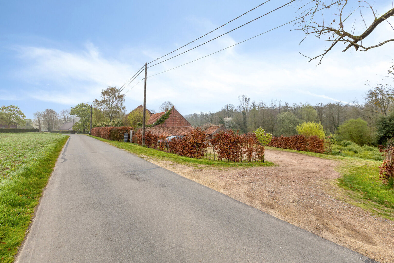 De hoeve bevindt zich op een ruim perceel van 31 are 5 centiare en beschikt over een brede oprit met voldoende parkeergelegenheid. Dankzij de aanwezige beplanting en omheining geniet het perceel van een hoge mate van privacy. De tuin biedt een open uitzicht over het volledige perceel en de achtergelegen bossen.
