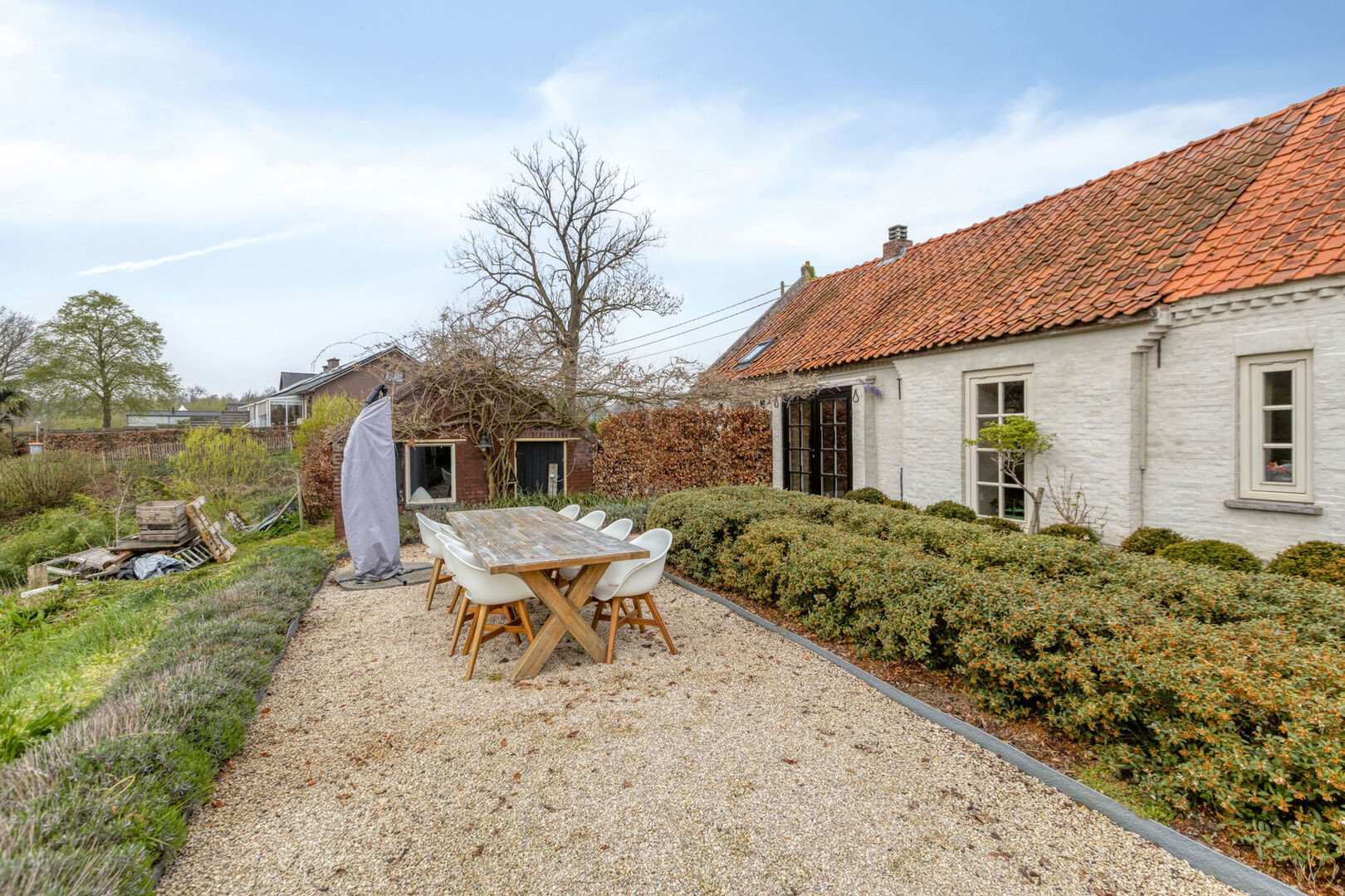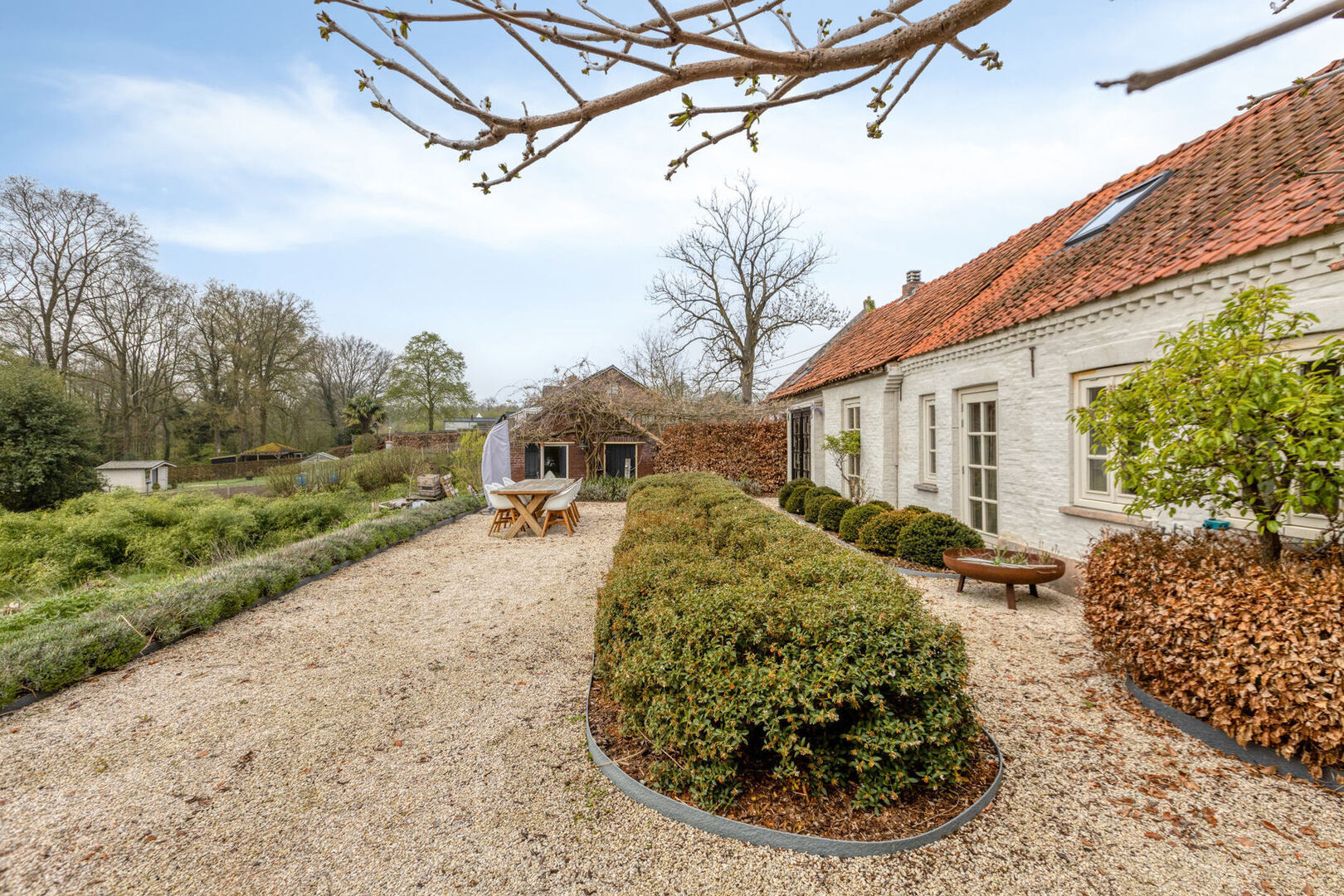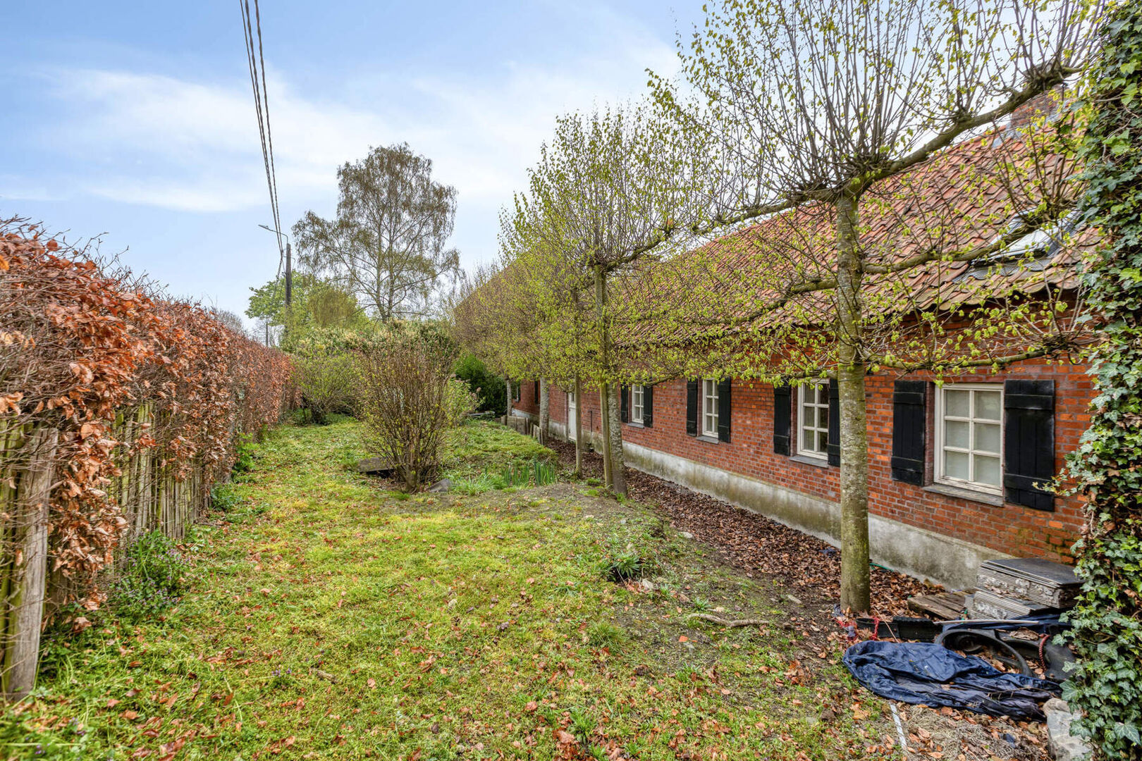 De hoeve bevindt zich op een ruim perceel van 31 are 5 centiare en beschikt over een brede oprit met voldoende parkeergelegenheid. Dankzij de aanwezige beplanting en omheining geniet het perceel van een hoge mate van privacy. De tuin biedt een open uitzicht over het volledige perceel en de achtergelegen bossen.