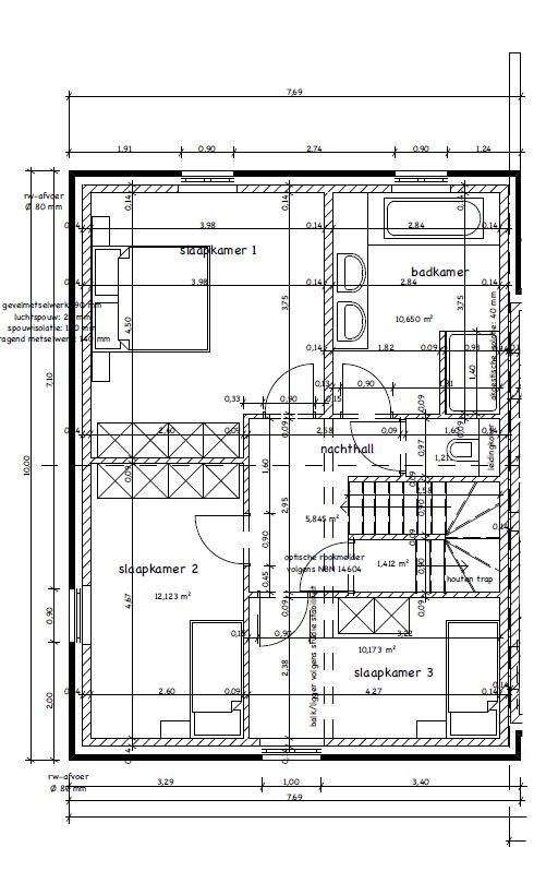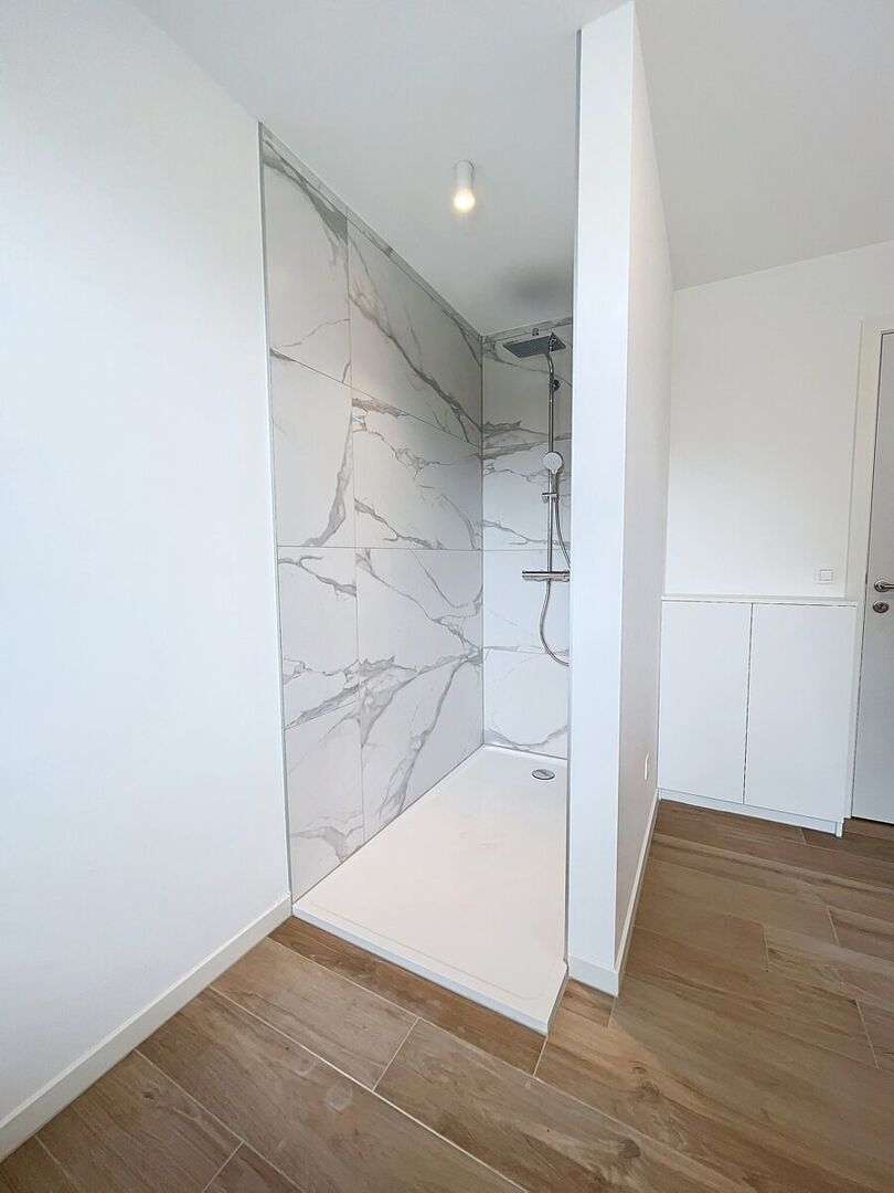 1e verdieping: nachthal (± 5,8 m²), slaapkamer 1 (± 18,8 m²), slaapkamer 2 (± 12,1 m²), slaapkamer 3 (± 10,2 m²), badkamer (± 10,7 m²) met bad, inloopdouche, meubel met dubbele spoelbak en spiegel, toilet (± 1,2 m²) en traphal (± 1,4 m²).
