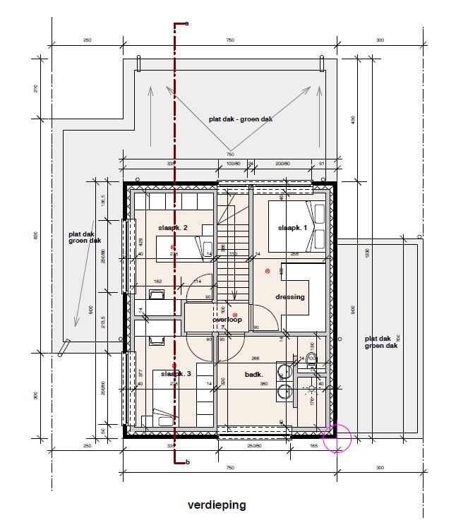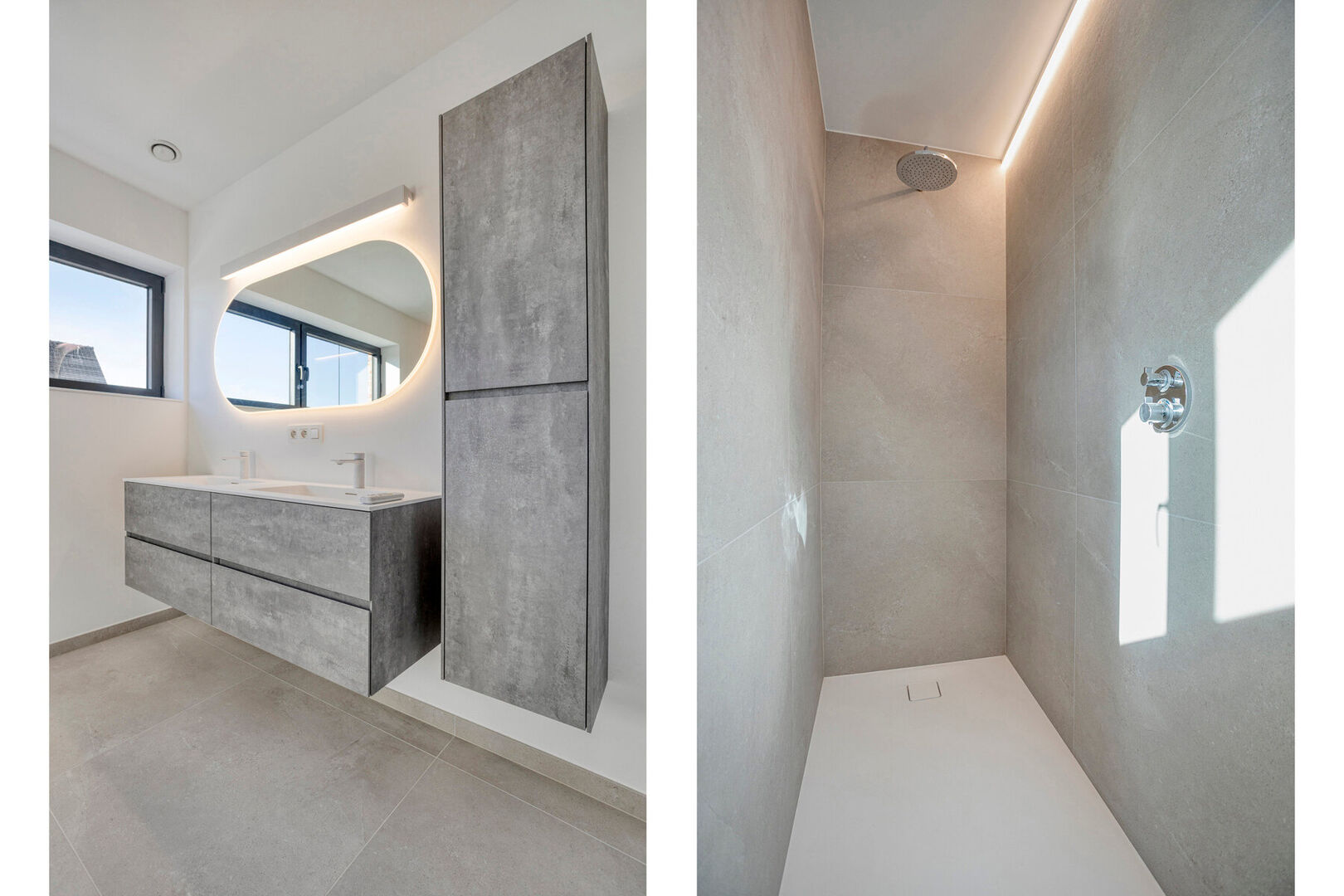 1e verdieping: nachthal (± 2 m²), slaapkamer 1 (± 12,4 m²), slaapkamer 2 (± 11,3 m²), slaapkamer 3 (± 9,8 m²) en badkamer (± 10,3 m²) met toilet, meubel met onderkast en dubbele wastafel, kolomkast, spiegel, ingebouwde kast en inloopdouche.