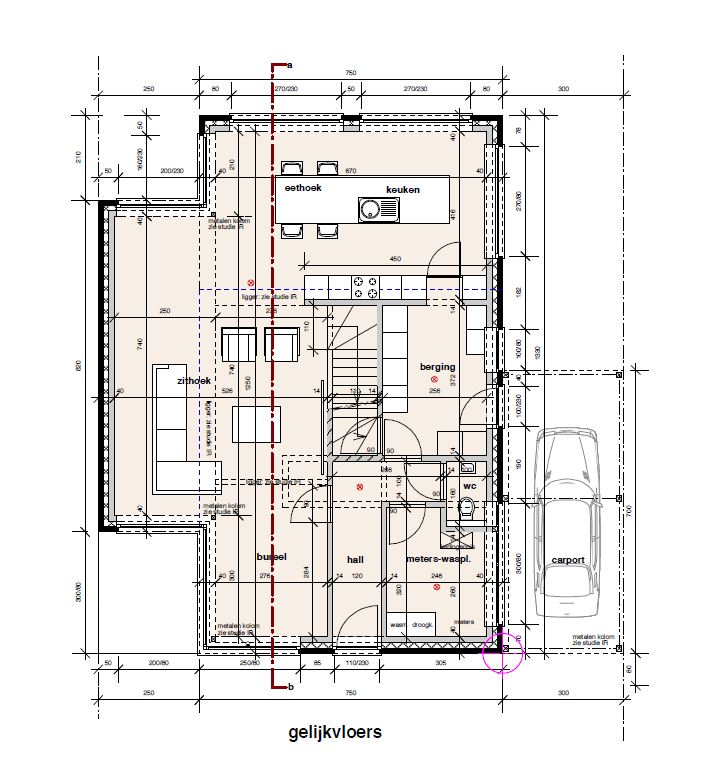 Gelijkvloers: inkomhal (± 6,7 m²), leefruimte met zitgedeelte (± 33,3 m²), bureelgedeelte (± 8,3 m²) en keukengedeelte (± 27,9 m²), ingericht met onder- en bovenkasten, eiland, composieten werkblad, inductievuur, koelkast, vaatwasser en spoelbak, berging (± 9,5 m²), gastentoilet (± 1,6 m²) met ingebouwde kast, wastafeltje en spiegel en wasplaats (± 7,2 m²) met ingebouwde kast, onderkast, werkblad en spoelbak. Tuin met terras en tuinberging en carport aan linkerzijde van de woning.