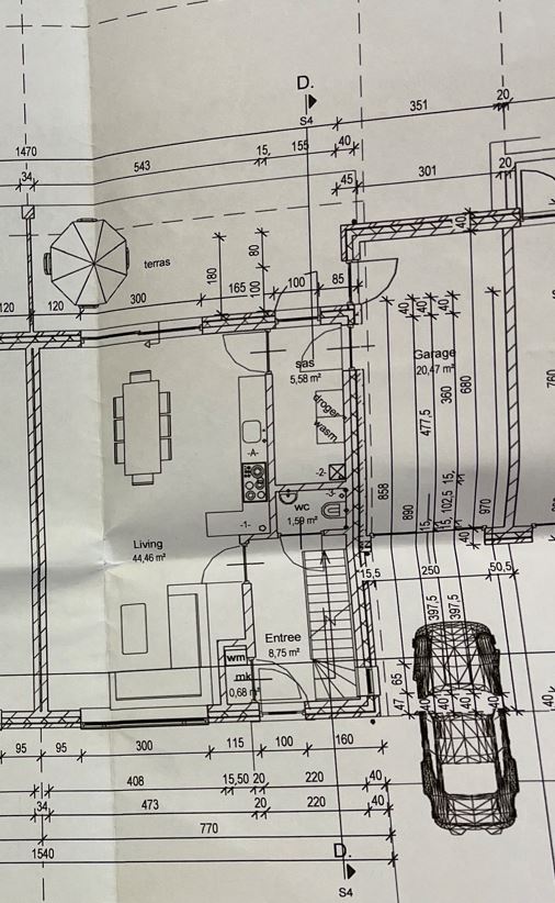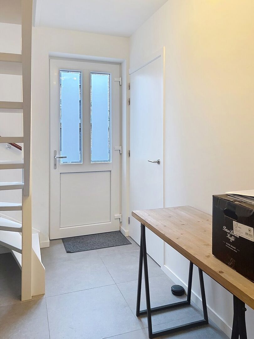 Gelijkvloers: Inkomhal (± 8,8 m²), toilet (± 1,6 m²), leefruimte met keuken (± 44,5 m²) die ingericht is met onderkasten, bovenkasten, eiland, inductievuur, enkele spoelbak, koelkast en vaatwasser, inkomhal achter (± 5,6 m²), garage (± 20,5 m²), terras en tuin.