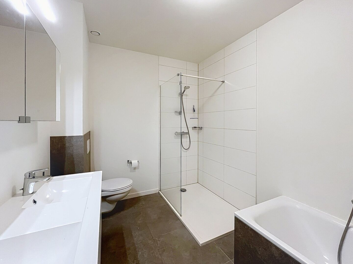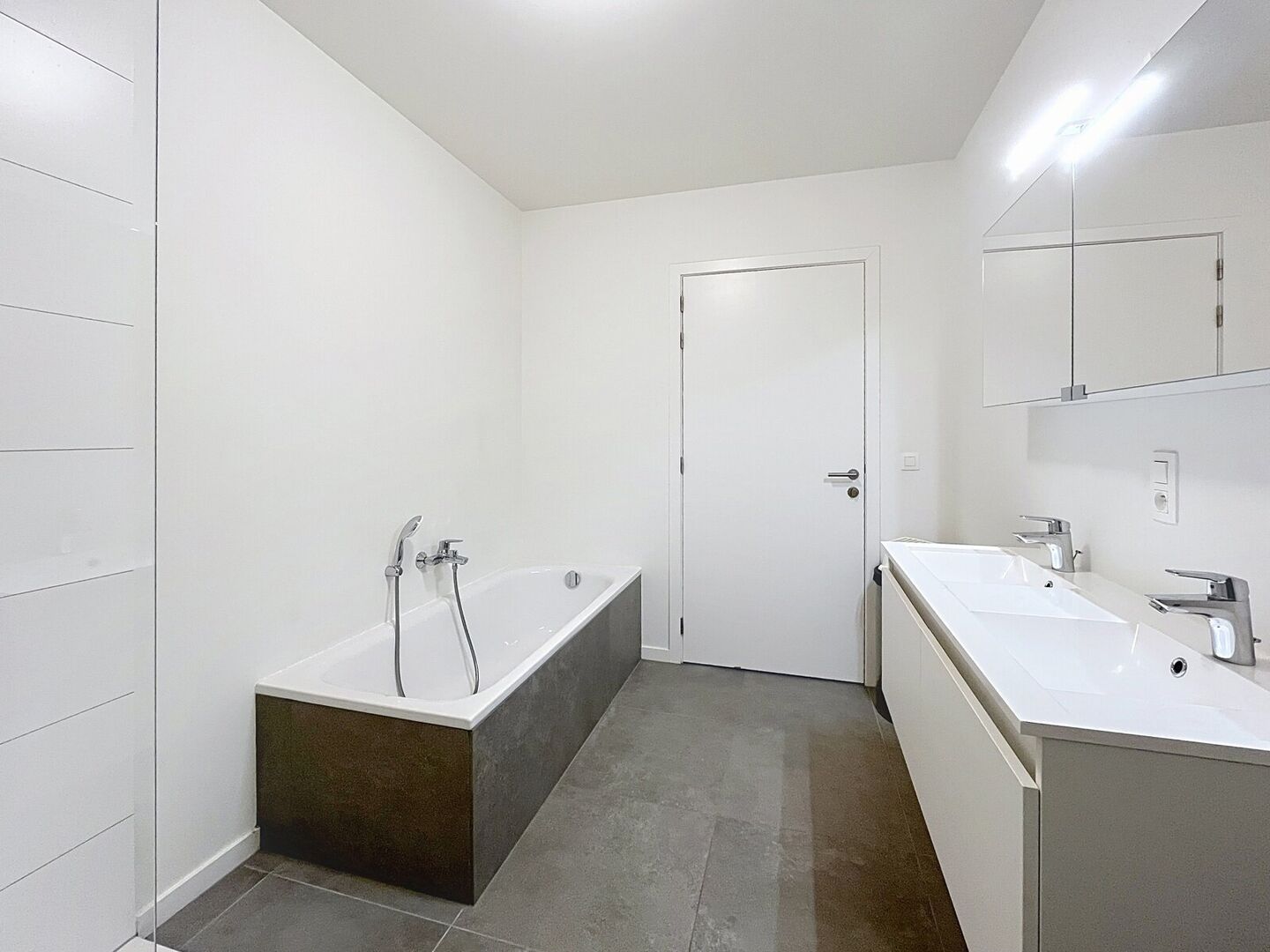 1e verdieping: nachthal (± 12,1 m²) met tegelvloer, badkamer (± 7,8 m²) ingericht met meubel met dubbele wastafel, onderkast, kolomkast en spiegel met verlichting, bad, toilet en douche, 3 slaapkamers(± 14 m², ± 16,8 m² en ± 9,2 m²).