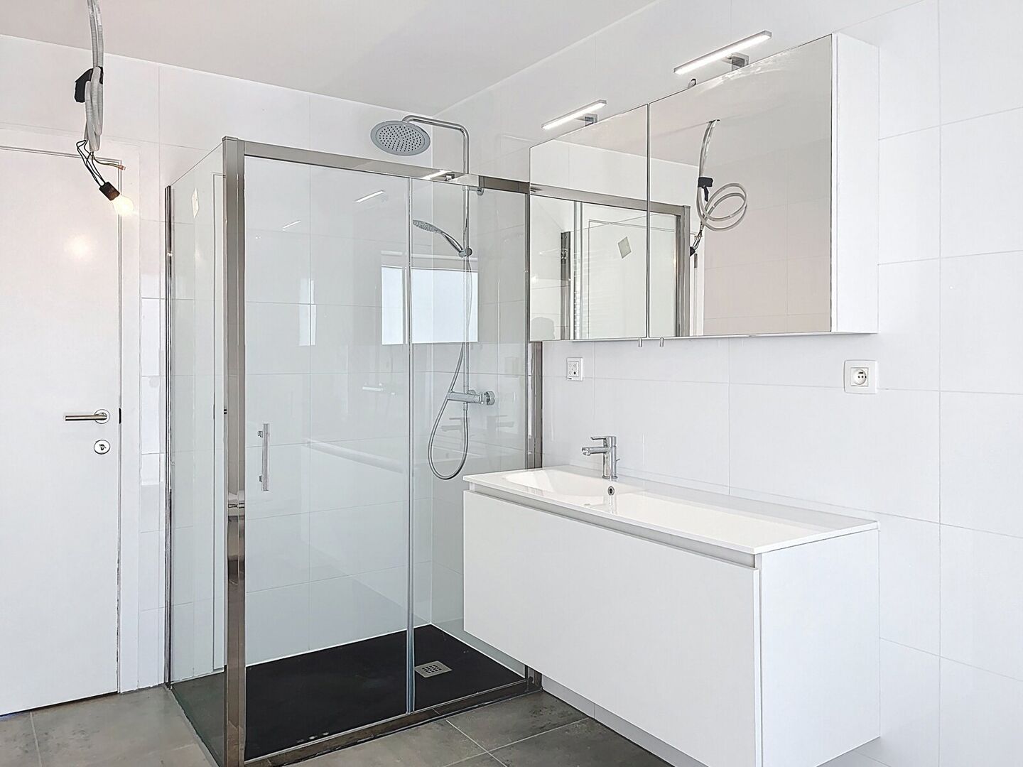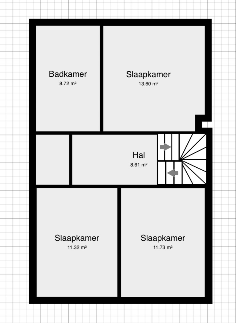 1e verdieping: nachthal (± 8,6 m²), slaapkamer 1 (± 11,7 m²), slaapkamer 2 (± 11,3 m²), wasplaats (± 2,2 m²), badkamer (± 8,7 m²) met wastafel en ondermeubel, spiegelkast, inloopdouche en toilet en slaapkamer 3 (± 13,6 m²).
