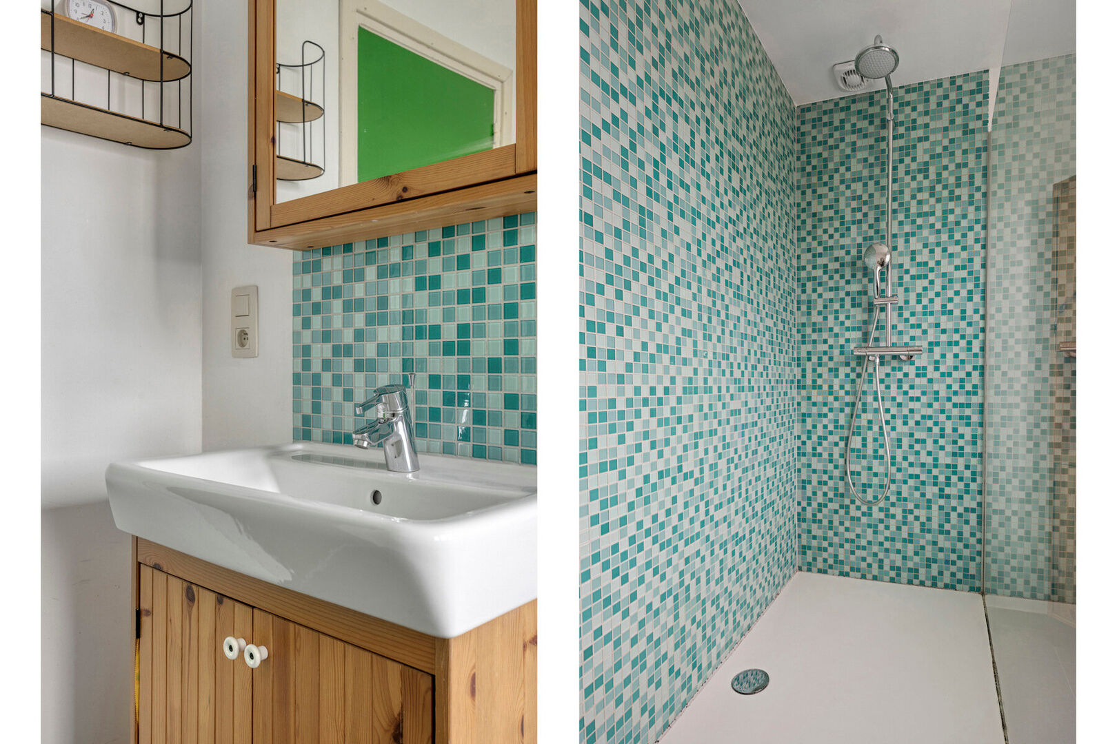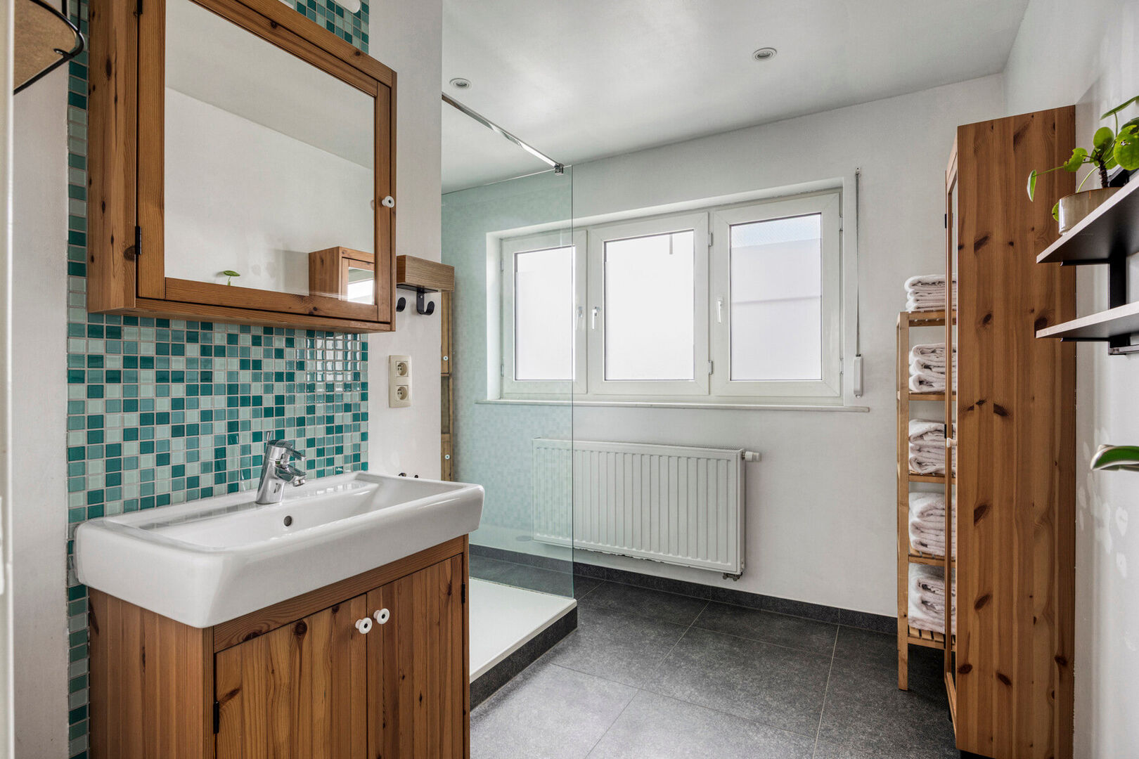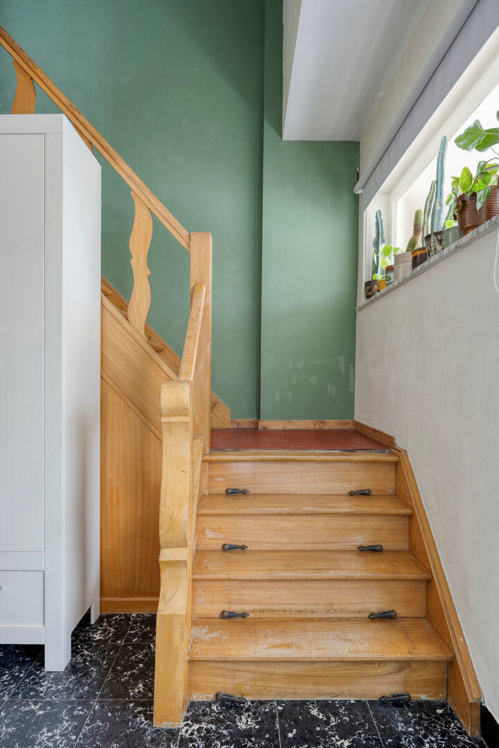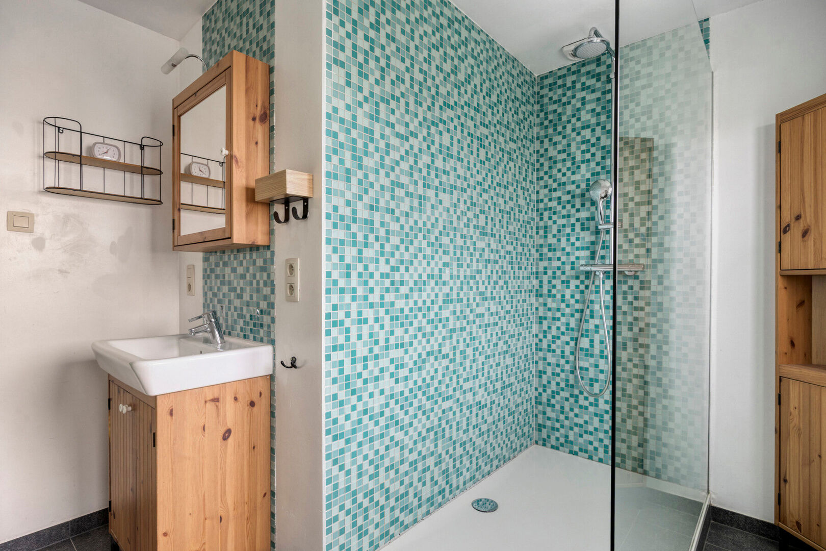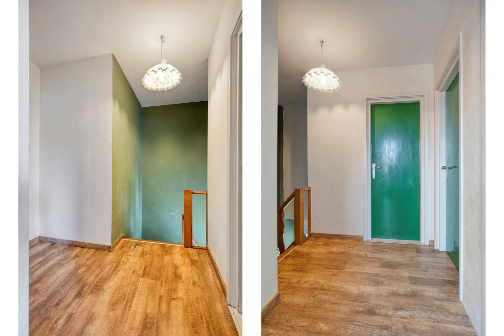 Eerste verdieping: nachthal, 3 slaapkamers waarvan één uitgerust met airco, vernieuwde badkamer met inloopdouche