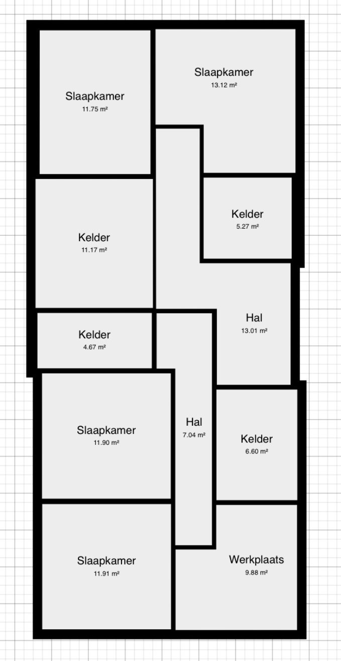 Kelder: traphal (± 13 m²), voorraadruimte 1 (± 5,3 m²), slaapkamer 2 (± 13,1 m²), slaapkamer 3 (± 11,8 m²), cv-ruimte (± 11,2 m²), nachthal (± 7 m²), voorraadruimte 2 (± 4,7 m²), slaapkamer 4 (± 11,9 m²), slaapkamer 5 (± 11,9 m²), werkplaats (± 9,9 m²) en voorraadruimte 3 (± 6,6 m²).